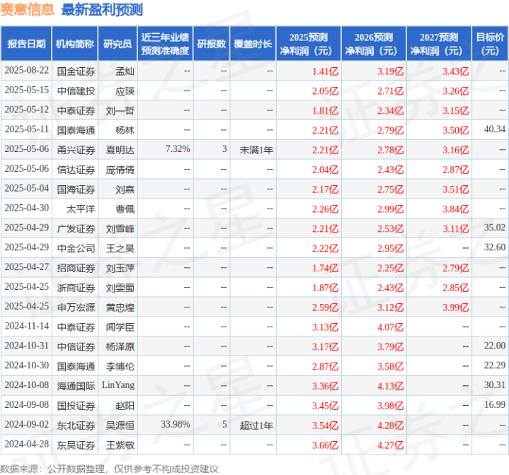 证券之星数据中心根据近三年发布的研报数据计算,东北证券吴源恒研究员团队对该股研究较为深入,近三年预测准确度均值为33.98%,其预测2025年度归属净利润为盈利3.54亿,根据现价换算的预测PE为30.62。
